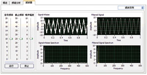 圖6就是使用NILabVIEW圖形化開發平臺實現軟件濾波的實例,當信號具有一定噪聲時,通過LabVIEW自帶的濾波器VI,對信號進行低通濾波,濾除掉25Hz以上的噪聲,從而得到原始信號(FiteredSignal)。