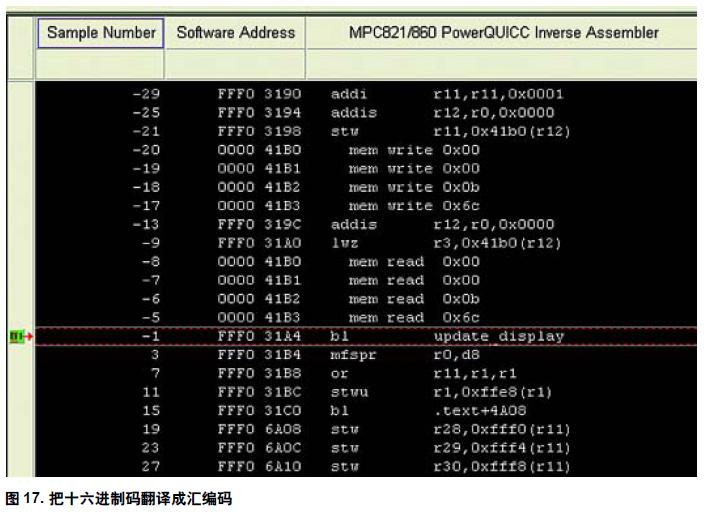 在使用處理器時,特定的十六進制字符包含一個處理器指令。如果您很熟悉十六進制代碼,就能查看這些類似圖13 所示的十六進制代碼表,并知道它們代表的指令。但我們大部分人做不到這一點。因此,絕大多數(shù)分析儀制造商設計了稱為反匯編器的軟件包。這些軟件包把十六進制代碼轉換成易于閱讀的匯編碼。例如圖13中有0000 41B0 和0000 41B1。我們可以從MotorolaPowerQUICC 手冊中查到它們代表存儲器寫0x00 指令。反匯編器可以為我們做這些事情,使我們不需要查找這些代碼。請查看圖17 并注意它們之間的差別。