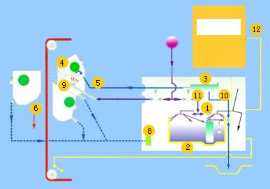 其工藝過(guò)程如圖3所示,泵①抽取液槽②的液體或水,通過(guò)過(guò)濾器③輸送到噴盤(pán)架⑤上各種噴盤(pán)④中;當(dāng)平幅運(yùn)行的織物⑥通過(guò)時(shí),液體便噴射其上;末被噴射到織物上的液體則通過(guò)回流管⑦流回到液槽;通過(guò)預(yù)過(guò)濾器⑧清除回流液體中的雜質(zhì);清洗裝置⑨⑩⑾保證了供液體單元的清洗,控制單元⑿控制整個(gè)裝置。