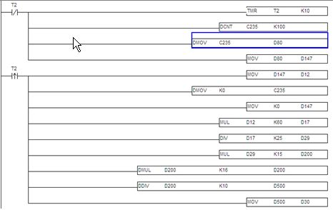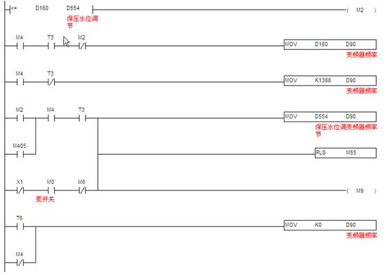 3.2.1測(cè)速程序:此部分程序原理就是采用PLC內(nèi)置的高速計(jì)算功能,計(jì)算單位時(shí)間內(nèi)從測(cè)速編碼器過(guò)來(lái)的脈沖數(shù),然后根據(jù)相關(guān)機(jī)械系數(shù)折算成線速度,這個(gè)值作為計(jì)算供水泵頻率的一個(gè)系數(shù),然后根據(jù)濕度設(shè)定值,計(jì)算出實(shí)際所需的供水頻率。見(jiàn)圖8。