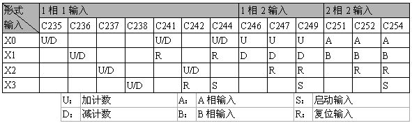 其中輸入點(diǎn)為X0、X1可規(guī)劃成更高速的計(jì)數(shù)器,1相輸入可達(dá)20kHz,但這兩個(gè)輸入點(diǎn)的計(jì)數(shù)頻率相加仍必須小于或等于頻寬20kHz的限制。若計(jì)數(shù)輸入為2相輸入信號(hào),則計(jì)數(shù)頻率約為4kHz。輸入點(diǎn)X2、X3高速計(jì)數(shù)器1相輸入可達(dá)10kHz。