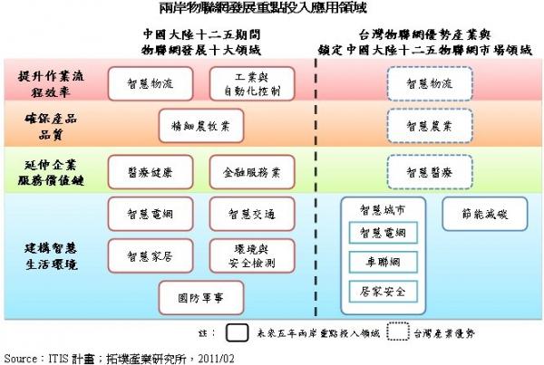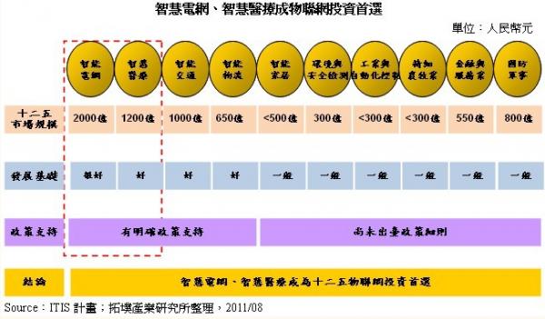 歐美經(jīng)濟(jì)體危機(jī)四伏,中國大陸市場需求反而撐起全球經(jīng)濟(jì)半邊天。不可諱言,面對全球不景氣環(huán)境,未來兩岸合作將是臺(tái)灣經(jīng)濟(jì)得以維持成長的主要?jiǎng)幽苤弧8鶕?jù)拓墣產(chǎn)業(yè)研究所ITIS計(jì)劃顯示,目前全球皆密切關(guān)注的“中國大陸十二五規(guī)劃”中,對于通訊基礎(chǔ)建設(shè)和IC產(chǎn)業(yè)的高度重視,連帶也為“物聯(lián)網(wǎng)”產(chǎn)業(yè)的快速發(fā)展埋下伏筆。