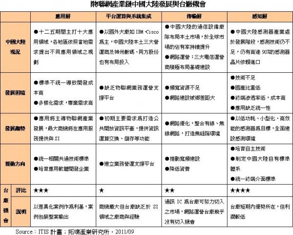 感知層一直以來都是臺(tái)廠之強(qiáng)項(xiàng),加上中國大陸目前技術(shù)較為薄弱,短期臺(tái)灣感測芯片廠具有較大之優(yōu)勢。應(yīng)用部分,智能電網(wǎng)與智能醫(yī)療在中國大陸將是最大的應(yīng)用領(lǐng)域與投資方向。但由于物聯(lián)網(wǎng)應(yīng)用范圍廣大,涉及各個(gè)層面,資源難以集中發(fā)展,臺(tái)廠可藉由差異化案例作為利基,將解決方案包裝后整案輸出。例如,臺(tái)灣目前推動(dòng)的智能生活計(jì)畫,所積累的物聯(lián)網(wǎng)發(fā)展經(jīng)驗(yàn)及成熟技術(shù),如智能農(nóng)業(yè)、智能醫(yī)療、智能電表等,都是臺(tái)廠可藉力使力、搶攻物聯(lián)網(wǎng)應(yīng)用市場的機(jī)會(huì)。