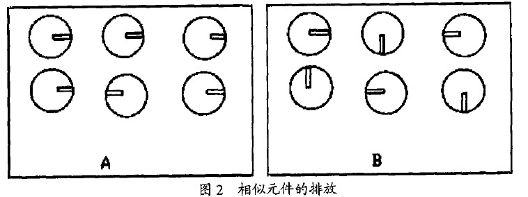 2)相似的元件在板面上應以相同的方式排放。例如使所有徑向電容的負極朝向板件的右面,使所有雙列直插封裝(DIP)的缺口標記面向同一方向等等,這樣可以加快插裝的速度并更易于發現錯誤。如圖2示,由于A板采用了這種方法,所以能很容易地找到反向電容器,而B板查找則需要用較多時間。