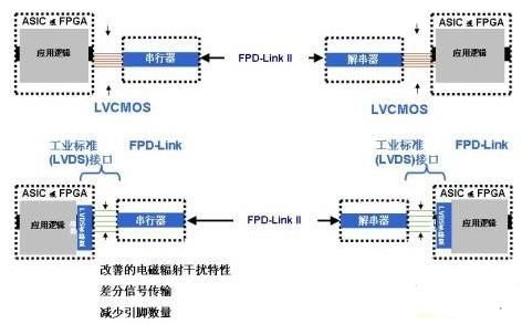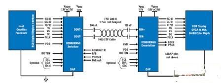 一旦接收器PLL鎖定在發(fā)射器的頻率下,即可由LOCK輸出標(biāo)志引腳顯示這一狀態(tài),確保接收器輸出的數(shù)據(jù)完整性。DS90UR907/8芯片組具有DS90UR905/6芯片組的一切特性,兩耳區(qū)別在于輸入輸出不再是發(fā)送LVCMOS信號的并行總線,而是遵照開放的工業(yè)標(biāo)準(zhǔn)"FPD-Link"。很多現(xiàn)代化的圖像控制器、顯示定時控制器、ASIC和FPGA都支持這種"一級串行化"技術(shù),它采用適合18bpp的3個數(shù)據(jù)通道,或者適合24bpp的4個數(shù)據(jù)通道,每一個都有一路并行時鐘通道。電信號的發(fā)送遵循開放的ANSI/TIA/EIA-644A標(biāo)準(zhǔn),該標(biāo)準(zhǔn)又稱作"LVDS"(低壓差分信號傳輸)。使用該接口技術(shù)代替常規(guī)LVCMOS的優(yōu)勢在于:采用差分信號可降低電磁干擾,并減少組件的引腳數(shù)量,如圖3所示。