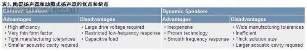如今的便攜式設備需要更小、更薄、更省電的電子元器件。對于設計小巧的手機,動圈式揚聲器成為了制造商能否生產出超薄手機的制約因素。在這一需求的推動下,陶瓷或壓電揚聲器迅速興起,成為動圈式揚聲器的替代方案。陶瓷揚聲器能以超薄、緊湊的封裝提供極具競爭力的聲壓電平(SPL),具有取代傳統的動圈式揚聲器的巨大潛力。動圈式揚聲器和陶瓷揚聲器的區別如表1所示。