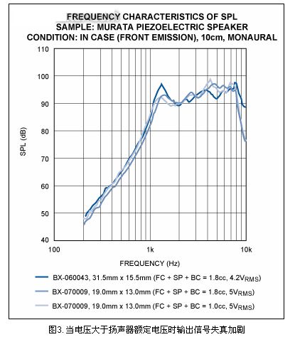 陶瓷揚聲器制造商通常規定了揚聲器的最大驅動電壓,典型值15VP-P。電壓最大時陶瓷器件的偏移量達到極限。外加電壓大于額定電壓時不會導致聲壓升高,反而增加了輸出信號的失真度。圖3為電壓最大時,陶瓷揚聲器輸出聲壓(SPL)與頻率的關系曲線。通過對比SPL與頻率的關系曲線圖以及阻抗與頻率的關系曲線圖,可以明顯看出壓電揚聲器產生高SPL時,在自激頻率處效率最高。