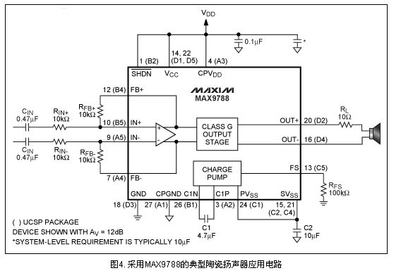圖4中的MAX9788采用一個片上電荷泵產生與VDD相反的負電源電壓。當輸出信號需要高壓驅動時,負電源電壓作用于輸出級。MAX9788提供了一種驅動陶瓷揚聲器的優化方案,比采用AB類放大器和升壓轉換器的傳統方案更高效。
