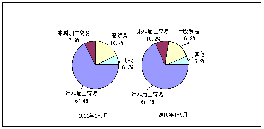 加工貿易出口比重下滑。1-9月,來、進料加工貿易出口額分別為381和3241億美元,同比增長-10.7%和13.9%,增速低于行業平均水平25.1和0.5個百分點,加工貿易出口比重為75.4%,比去年同期下降2.5個百分點。9月份,來料加工出口下降21.0%,進料加工出口增長8.8%。