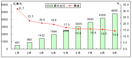一般貿易出口增長較快。1-9月,一般貿易出口884億美元,同比增長29.9%,增速比行業平均水平高15.5個百分點,占行業比重(18.4%)比去年同期提高2.2個百分點。9月份,一般貿易出口增長18.4%,高于全行業平均水平11.0個百分點。