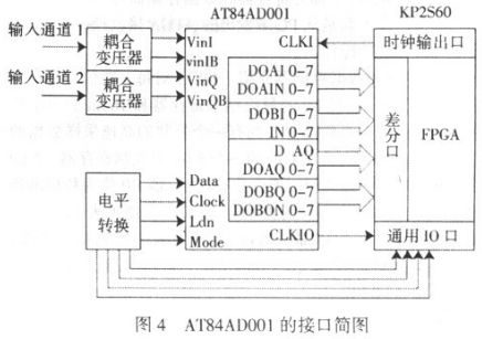 (2)高頻部分。主要是對脈沖數字信號的采集,包括頻率測量和信號采集兩個部分。脈沖數字信號的頻率是確定電路板是否工作正常的重要參數,因此確定脈沖信號的頻率是否正常是本測試系統的必要工作。本系統是將待測信號接入FPGA 與53MHz 的高精度時鐘同時開始計數,一段時間后,通過兩個信號的計數值來計算脈沖信號頻率的。信號采集是以AT84AD331 作為采集芯片。AT84AD331 與EP2S63 的連接見圖4。