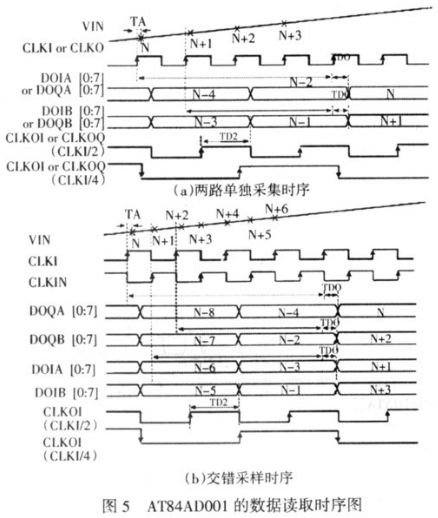 AT84AD331 可以配置成I 路和Q 路單獨使用,此時可以同時采集兩路信號,最高采樣率為1 Gs/s;也可以配置成I 和Q 路的交錯采樣,此時只能采集1 路信號,等效采樣率為2 Gs/s,使用時可以根據需要對該芯片進行在線配置。FPGA 對AT84AD331數據讀取時序見圖5。