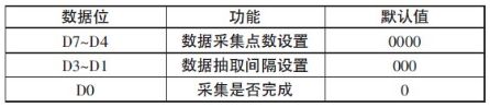 其中D7~D4 為數據采集的點數設置,3333B 表示64 個,1111 表示1 324 個,步進為64。D3~D1 為數據抽取的間隔設置,333 表示抽取間隔為3,全部數據有效;111 表示抽取間隔為28,即每隔28 個點抽取一個點,步進為4。設置這幾位的目的是為了適應信號頻率的要求,防止采集數據不足一周期的狀況發生。D3位為標志位,功能和操作與5 bit 的寄存器的對應位完全相同。本寄存器分高4 位和低4 位兩次設置。