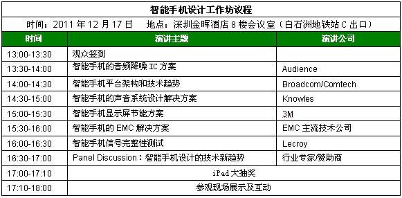 - 智能手機(jī)設(shè)計(jì)工作坊將于2011年12月17日下午在深圳金暉酒店召開(kāi)