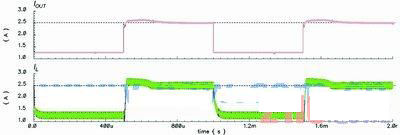為了說明這個方案,圖1中的降壓轉(zhuǎn)換器會采用這些配置:L=20mH、COUT=47mF、RL值在2.64W(正常模式)~1.1W(電流限制模式)間轉(zhuǎn)換,并會使用一個tD=100ns的比較器,而IOUT(CL,DES)和IL(RIPPLE)分別是2.5A和0.3A。不過,如果使用傳統(tǒng)的峰值電流限制方法,那么式(1)中的IV便會設定為2.35A,傳統(tǒng)方法的模擬結果如圖4所示。由此可以看到,IOUT(CL)會由于tD的影響而低于2.5A。然而,使用新方法并將ILR設定在2.5A,IOUT(CL)便可如圖5所示達到2.5A。于是,傳統(tǒng)方法中出現(xiàn)的問題便能夠在該方案中解決。
