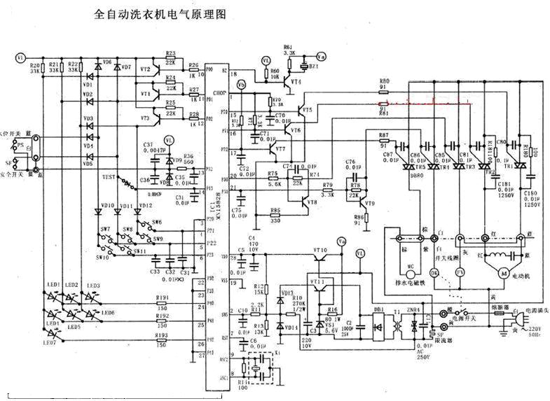 全自動洗衣機由洗衣系統和控制電路組成。其控制電路分為機械和電腦型,電腦型控制電路是以單片機作為控制電路的核心。圖1給出單片機Z86C09組成的全自動洗衣機的控制電路。