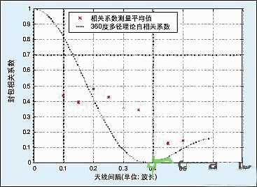 圖5:在市區、非LOS環境下,空間分集測量中封包(envelope)相關系數與天線間隔關系