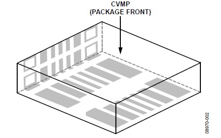 關(guān)于垂直和水平安裝方向的CVMP焊盤布局(焊盤圖形),請(qǐng)參閱本應(yīng)用筆記的"焊盤布局"部分。CVMP背面的焊盤布局如圖7所示。注意,封裝正面上有一些額外的焊盤(見(jiàn)圖4)沒(méi)有顯示在焊盤布局中,這些焊盤用作測(cè)試點(diǎn),不應(yīng)進(jìn)行電氣連接。
