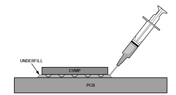 圖5. 底部填充(可以是在回流焊之后以液體形式填充,或者在芯片貼裝到PCB之前以膏體或固體形式涂敷填充)。