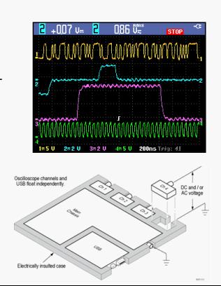 THS3000系列產品型號分為帶寬100 MHz、最大采樣率2.5 GS/s和200 MHZ、5 GS/s兩種,性能達到同類最佳。具備四個隔離通道,每通道10,000個樣點的記錄長度使用戶能夠以高采樣率捕獲大量信號信息,從而清楚地看到信號細節,快速發現信號異常。THS3000示波器上的各個通道與機身接地以及各通道相互之間是隔離的。另外,用于數據存儲、儀器設置和PC通信的外部USB輸入也是隔離的。這讓用戶能夠安全地使用隨附的10X探頭進行電壓高達300 VRMSCAT III的浮動測量,或使用可選探頭進行電壓高達1000 VRMSCAT II的浮動測量。該儀器具有600 VRMSCAT III 防護等級的輸入(BNC連接器至大地),以保證安全的高壓測量。