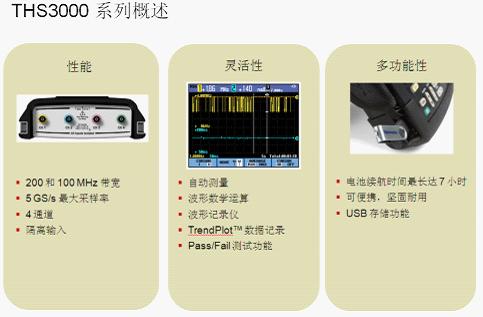THS3000示波器提供和其他所有泰克示波器一樣的直觀用戶界面,易于使用。對于初始設置或測試點不斷變化的情形,THS3000系列提供了一鍵自動設置(Autoset)和自動定量程(Autorange)功能,可自動設置示波器的觸發系統并調整垂直和/或水平設置,具有如前所述的內置測量數據記錄功能和自動波形記錄。提供多種語言的用戶警告幫助,用戶可更換電池,支持波形、BMP 圖像和示波器設置文件(趨勢數據和波形記錄內容)的USB 存儲,方便方便用戶做后續的分析。