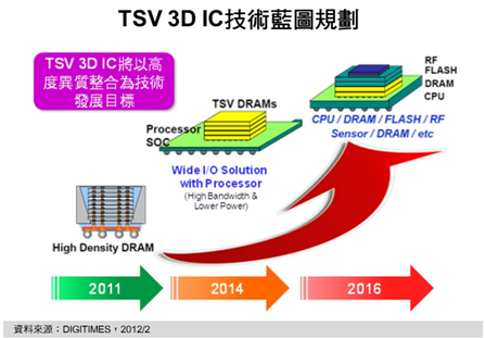 綜合各主要芯片制造商技術(shù)藍圖規(guī)畫,2011年TSV 3D IC是以同質(zhì)整合的高容量DRAM產(chǎn)品為主,至2014年,除將以多顆DRAM堆棧外,尚會整合一顆中央處理器或應(yīng)用處理器的異質(zhì)整合產(chǎn)品。柴煥欣也預(yù)估,要至2016年,才有機會達到將DRAM、RF、NAND Flash、CPU等各種不同的半導(dǎo)體組件以TSV 3D IC技術(shù)整合于同1顆IC之中異質(zhì)整合水平。