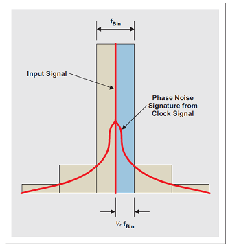 在采樣過程中,輸入信號與采樣時鐘信號混頻在一起,包括其相位噪聲。當進行輸入信號 FFT 分析時,主 FFT 容器 (bin) 集中于輸入信號。采樣信號周圍的相位噪聲(來自時鐘或輸入信號)決定了鄰近主容器的一些容器的振幅,如圖 7 所示。因此,小于 1/2 容器尺寸的偏頻的所有相位噪聲都集中于輸入信號容器中,且未增加噪聲。因此,相位噪聲整合帶寬下限應設定為 1/2 FFT 容器尺寸。 FFT 容器尺寸計算方法如下:
