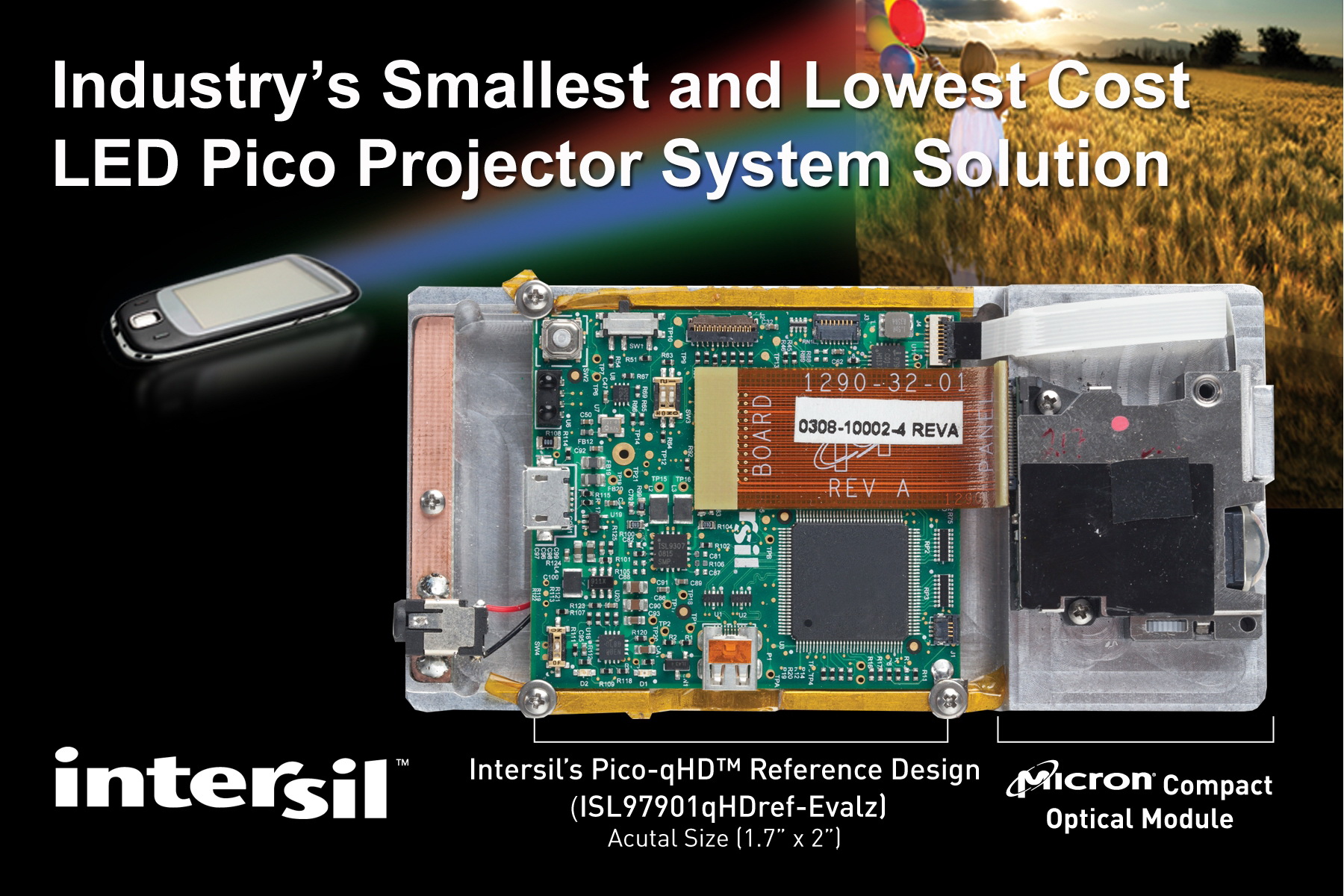 Intersil Pico-qHD™ 為低功耗和成本敏感型嵌入式或配套微型投影儀應用而開發,提供了完全集成的參考設計,其中包括高量生產的光引擎、硬件、固件和可定制設計文件。該低成本的系統解決方案,采用美光(Micron)公司的 E330 緊湊型 5.5 立方厘米 qHD 光引擎,可以輕松集成到廣泛的應用,包括美光最近推出的便攜式PoP Video™微型投影儀移動設備配件。Pico-qHD™ 建立在緊湊、便宜的 1.7×2 英寸印刷電路板,可滿足如消費類等應用的低制造成本要求,如數碼相機、移動電話、平板電腦、視頻播放器和其他手持產品。受這些應用的推動,太平洋媒體協會(Pacific Media Associates)預測微型投影儀的年銷售量將在2015年達到5800萬件。