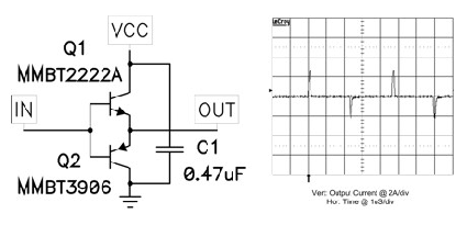 如圖2 hfe曲線所示,通常廠商都不會為這些低電流器件提供高于0.5A的電流。但是,該電路可提供大大高于0.5A的電流驅動,如圖1中的波形所示。就該波形而言,緩沖器由一個50Ω源驅動,負載為一個與1Ω電阻串聯的0.01 uF電容。該線跡顯示了1Ω電阻兩端的電壓,因此每段接線柱上的電流為2A.該數字還顯示MMBT2222A可以提供大約3A的電流,MMBT3906吸收2A的電流。