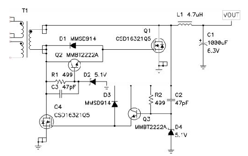 圖 4 顯示的是用于控制同步反向拓撲中 Q2 傳導的分立器件。該電路可以讓您控制開啟柵極電流并保護整流器柵極免受高反向電壓的損壞。該電路可以用變壓器輸出端的負電壓進行驅動。12V 輸入與 5V 輸出相比負電壓值很大,從而引起 Q1 傳導并短路電源 FET Q2 上的柵-源電壓,迅速將其關閉。由于基極電流流經 R2,因此在加速電容 C1 上就有了一個負電壓。在此期間,一次側 FET 將會發生傳導并在變壓器磁化電感中存儲能量。一次側 FET 關閉時,變壓器輸出電壓在正電壓范圍擺動。Q2 柵-源通過 D1 和 R1 被迅速前向偏置。C1 放電時,D2 對 Q1 基極-發射極連接進行保護。在一次側 FET 再次開啟之前,該電路會一直保持這種狀態。正如同步降壓轉換器那樣,輸出電流會真正地對輸出電容進行放電。開啟一次側 FET 會衰減變壓器二次側上的電壓并去除 Q2 的正驅動。這種轉換會導致明顯的貫通疊加一次側 FET 和 Q2 傳導次數。為了最小化該次數,當一次側和二次側 FET 均開啟時,Q1 將會盡快地短路同步整流器上的柵-源。