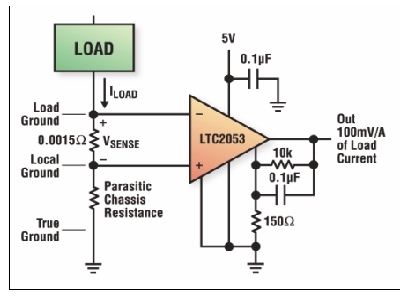 當實現低端電流檢測時有一個非常嚴重的問題。在接地路徑中采用一只電阻器,意味著負載的地電位隨著電流的變化而變化。這將引起系統的共模誤差,并在與要求相同地電位的其他系統連接時出現問題。因為VSENSE的幅度將影響分辨率,設計師需要在分辨率和接地噪聲方面進行權衡。100mV的VSENSE滿量程將轉換成100mV的注入接地噪聲。但是,可以通過將電流檢測電阻器置于電源和負載之間來避免出現上述地電平的變化問題。