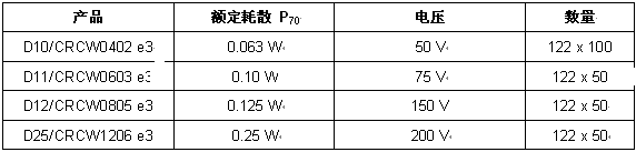 本次發布的4款設計套件采用E96系列阻值標準,范圍從10Ω到1MΩ(每檔間隔4個阻值),同時額外包含一個0Ω跳線,每款套件總共包含122種不同的阻值。電阻的容差為±1%,TCR為±100ppm/K,功率耗散為0.063W~0.25W,電阻芯電壓為50V~200V。