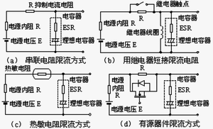 遠遠高于鋁聚合物電解電容器的紋波電流承受能力。必須考慮上電過程的沖擊電流限制。可以采用AC/DC變換器上電電流限制方法,如串聯(lián)限流電阻,見圖2(a),則: