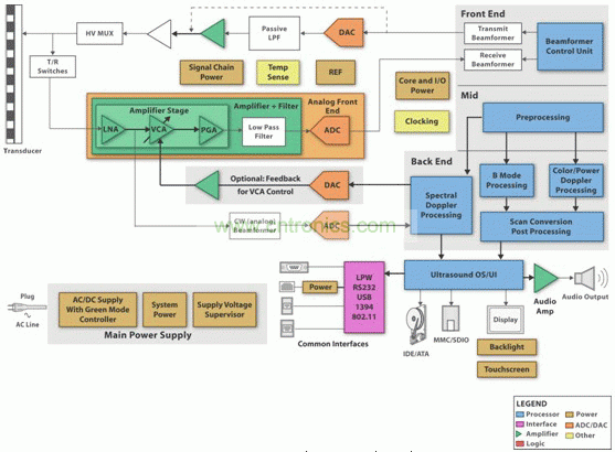 超聲波系統因其功能和性能不同而各異。例如,3D、4D 和諧波成像模式通常被用于高端系統,而只有 2D B-模式成像和頻譜多普勒可能被用于一些低端系統。功能差異主要取決于數字后端。高 端超聲波系統要求更多和更快的計算能力,其需要具有接近實時信號處理的高端 DSP。很明顯,在高端便攜式系統之間實現共享信號處理單元是非常困難的。但是,在不考慮不同性能要求的情況 下,超聲波系統通常擁有相似的接收通道架構。