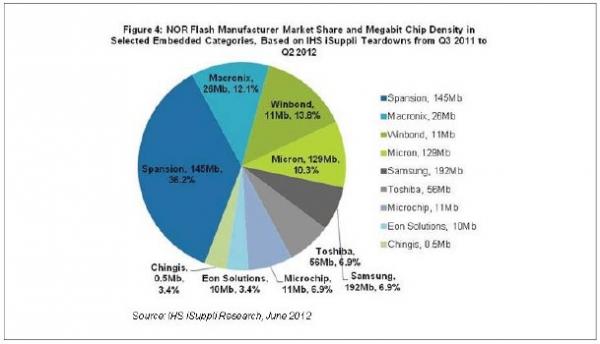 根據(jù)IHS iSuppli公司在三個季度內(nèi)拆解分析的55個嵌入產(chǎn)品,這些產(chǎn)品中有三分之一以上的NOR芯片屬于美國Spansion Inc.,在所有供應(yīng)商中處于領(lǐng)先地位,如圖所示。Spansion,以及韓國三星電子和美國美光,提供的NOR芯片平均密度為數(shù)百Mb。從2011年第三季度到今年第二季度,這三家公司占上述三個子領(lǐng)域中NOR芯片的53.4%。剩下的46.6%市場份額屬于生產(chǎn)100Mb以下密度NOR閃存的廠商。這類廠商包括臺灣旺宏電子和華邦電子等大型廠商,以及臺灣常憶科技和宜揚科技等規(guī)模較小的廠商。