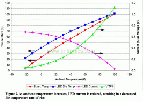 圖2 環境溫度上升,LED電流降低,從而達到更低的芯片溫升速率。
