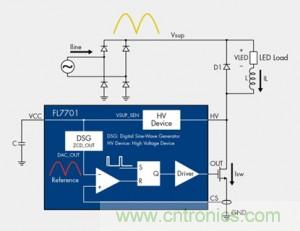 FL7701集成有功率因數(shù)校正(PFC)。可以從使用小型陶瓷維持電容的整流離線輸入來供電。這樣就可省去輸入端的電解電容,也不需要用于IC的自偏置電源軌。