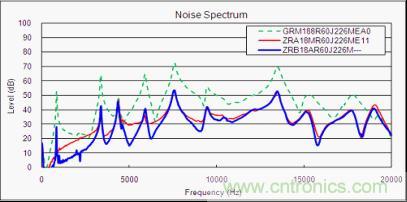 正如第2章所描述的那樣,如果向使用鐵電陶瓷的多層陶瓷電容器施加交流電壓,就會產生伸縮。ZR*系列產品通過將MLCC封裝于嵌入式基板上,可以抑制電容器振動(伸縮)向封裝基板的傳導,由此降低嘯叫等級。此外,還設計了通過在嵌入式基板的端部設置凹槽,降低對陶瓷電容器外部電極側表面焊接的潤濕量。由此可以將多層陶瓷電容器的振動(伸縮)應力降至最低,從而也降低了嘯叫等級。圖6為ZR*系列產品與通用系列產品的尺寸嘯叫等級比較圖。從中可以看出相較于通用產品,通過使用ZR*系列產品,會有20dB左右的降低效果(這就意味著人耳所感知的聲音程度已經減輕到1/10左右)。而且,由于ZRB系列產品被設計為使用與多層陶瓷電容器尺寸相同的嵌入式基板,所以如果在組件設計的最終階段發生嘯叫問題,那么無需變更印制基板(封裝間隔)即可實現置換(降低嘯叫等級)。(使用ZRA系列產品時,如果無法充分確保元器件之間的距離(已進行緊湊封裝),則可能會發生需要變更印制基板設計(封裝間隔)的情況。)