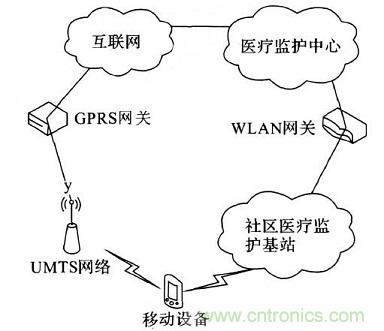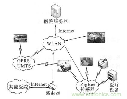系統(tǒng)中包括無線個人網(wǎng)絡(wireless person2al area network,WPAN ) 、ZigBee網(wǎng)絡以及一系列醫(yī)療監(jiān)護網(wǎng)絡的醫(yī)療傳感器節(jié)點。本系統(tǒng)具有良好的擴展性,例如醫(yī)護人員在急救途中或在其他醫(yī)院可以分別利用WLAN /UMTS網(wǎng)關和互聯(lián)網(wǎng)與系統(tǒng)進行信息交互。