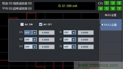 當(dāng)NULL功能設(shè)置為ON時(shí),NULL值設(shè)為之前測(cè)得的Udc和Idc(電壓/電流簡(jiǎn)單平均的數(shù)值數(shù)據(jù))、Speed和Torque(安裝電機(jī)卡功能,傳感器的輸入信號(hào)為模擬信號(hào)時(shí))。如果之前測(cè)得的Udc和Idc、Speed和Torque不存在,例如打開(kāi)電源和NULL功能而沒(méi)有執(zhí)行測(cè)量,Udc和Idc將設(shè)為“0”。NULL功能的設(shè)置如圖2所示。