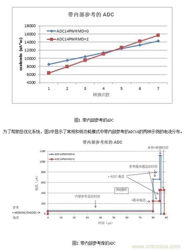 使用內部參考時,最低能耗模式取決于您的應用。應基于每個應用考慮以下因素,包括:ADC無源時啟用低功耗模式的節能、采樣時間、轉換次數、時鐘或其它地方使用的參考、時鐘頻率、轉換次數等。對于采樣時間長的應用,ADC采樣時間電流小于轉換電流,因此您看到的數據比數據表中的數值小。您可能需要做一些臺架測試,以了解您的應用的ADC電流消耗。