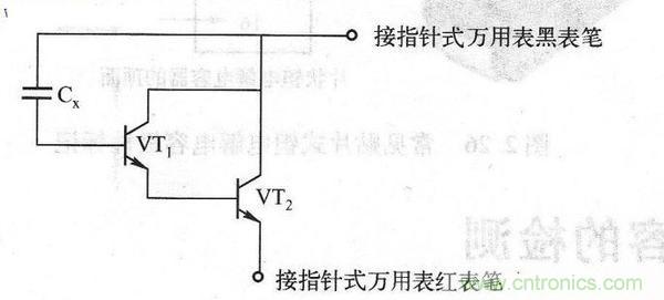 (3)檢測10pF~0.01 ;tF固定電容可采用如下方法。將萬用表調至R×10k擋,選用兩只卩值大于100的 三極管3DC6(或9013)組成復合管,其 電路原理圖如圖2所示。利用復合管的放大作用,把被測電容的充電電流予以放大,以增大萬用表指針的擺動幅度。將被測電容接于復合管的基極b與集電極c間,萬用表的紅、黑表筆分別與復合管的發射極e和集電極c相接。如果萬用表的指針微擺動后返回至無窮大處,則說明電容正常;如果指針不動或不能返回至無窮大處,則說明電容已損壞。在測試操作時,特別是在測量較小容量電容時,要反復調換被測電容引腳接觸兩點,以明顯地看到萬用表指針的擺動。