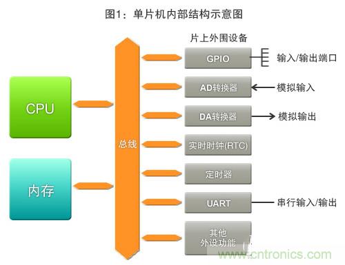 有效使用單片機不可或缺的“外設功能”是什么呢?正如過去連載的“單片機入門”系列中所介紹的那樣,對電子產品進行控制的單片機是由CPU、內存及外設功能等部分組成的(圖1)。CPU根據指令(程序),執行運算、數據的讀寫以及進行條件判斷等,而內存則用來保存該程序(記憶)。