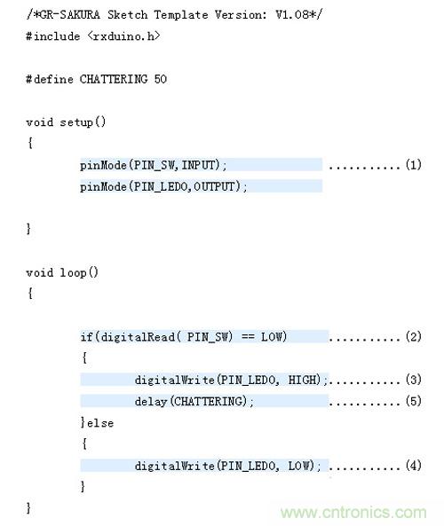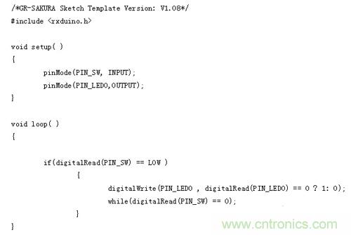 由于這次使用的是GR-SAKURA電路板上的開關和LED,所以即使不知道與其相連的引腳號和端口號,如為開關,只需在程序中寫入“PIN_SW”,如為LED,只需在程序中寫入“PIN_LED0”?“PIN_LED3”,櫻花程序庫(SAKURA Library)就會進行處理。