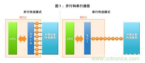 單片機是嵌入式設備的“頭腦”,其與作為嵌入式設備的“手和腳”是各種外圍設備(輸入輸出設備等)連接。單片機應該怎樣與這些外圍設備連接才好呢?比如,我們來考慮一下將傳感器與單片機連接的情況。如果使用本連載第1期中介紹的“GPIO”的話,從傳感器向單片機傳送8位信號時需要使用8個引腳。這種傳送模式被稱為并行(并行通信)模式(圖1―左)。但是,僅一個傳感器就需要連接8個引腳,確實太可惜了,是否還有連接更少的引腳就能達到同樣目的的方法呢?
