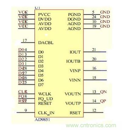 DDS單片頻率合成器AD9851的ROM中已預先存入正弦函數表,其幅度按二進制分辨率量化,其相位一個周期360o按2∏/232的分辨率設立相位取樣點。然后存入ROM相應地址中。工作時,用單片機送入頻率碼。輸入采用并行方式,8位一個字節,分5次輸入,其中32位是頻率碼,另8位中的5位是初始相伴控制碼,3位是掉電控制碼。改變讀取ROM的數目,即可改變輸出頻率。