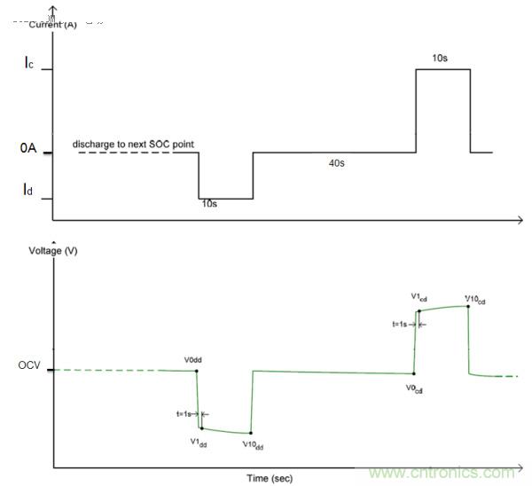 HPPC測試可測得電池的功率性能,開路電壓,直流內(nèi)阻等重要特性。HPPC測試制度是在某特定SOC目標(biāo)進(jìn)行10s脈沖放電,靜置40s,再10s脈沖充電。由此可測得該SOC點(diǎn)充電和放電方向的DCIR。需要注意的是在不同的測試方法下計(jì)算的DCIR會存在一定的差異。