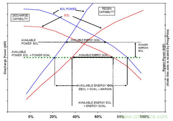 同時(shí)電池企業(yè)用以評估電池壽命終結(jié)的方法(容量衰減至BOL時(shí)的80%以下或內(nèi)阻增加50%以上)是比較籠統(tǒng)的。作為整車廠可以根據(jù)實(shí)際性能需求進(jìn)行更準(zhǔn)確的EOL確認(rèn)。下圖以一款混合動力車型電池壽命分析為例:兩條藍(lán)線分別是BOL時(shí)刻的充放電功率特性,綠色虛線為整車實(shí)際需求工況。則在BOL狀態(tài)下電池在20%~90%SOC區(qū)間內(nèi)都滿足整車功率需求,在可用能量上有一定的富裕。隨著電池性能的衰減,兩條紅線代表了功率性能的下降,其可用SOC區(qū)間為40%~75%,到達(dá)EOL零界點(diǎn)。一旦繼續(xù)衰減可用容量就無法滿足整車需求。