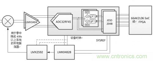 在射頻采樣無線電中,采樣時鐘的質(zhì)量好壞對系統(tǒng)產(chǎn)生的信噪比(SNR)具有強(qiáng)烈影響。LMK04828是兼容JESD204B的超低噪音時鐘抖動清除器,可生成小于100fs抖動、具有射頻采樣能力的時鐘,同時具有一系列收縮或簡化系統(tǒng)的特性。因支持最多七個JESD204B裝置,LMK04828可以為多個ADC32RF45 ADC、數(shù)字模擬轉(zhuǎn)換器(DAC)、FPGA或DSP記時。LMK04828還可以生成系統(tǒng)參考(SYSREF)信號,用于JESD204B系統(tǒng)中確定性延遲,而數(shù)字和模擬延遲可幫助滿足每個JESD204B設(shè)備的關(guān)鍵計時需求。