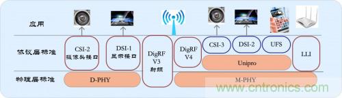 下圖2所示MIPI結(jié)構(gòu)分為物理層、協(xié)議層和應(yīng)用層。目前比較成熟的MIPI應(yīng)用有攝像頭CSI接口、顯示屏DSI接口和基帶和射頻間DigRF接口,而其他例如UFS、LLI等規(guī)范正在逐步制定和完善過(guò)程中。